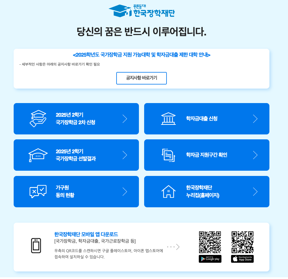 한국장학재단은 교육부 산하 공공 기관으로, 국가장학금부터 학자금 대출까지 대학생의 경제적 부담을 덜어주기 위한 다양한 지원을 운영하고 있는 곳입니다. 지금은 2025년 2학기 국가장학금 2차 신청 기간으로 한국장학재단에서 신청하실 수 있습니다.